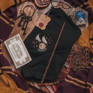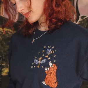 Cozy up in our “Catch Me” crewneck in the common room! This design includes beautiful direct garment embroidery of two flying keys, stars and a niffler trying to catch all of the shiny goods!!